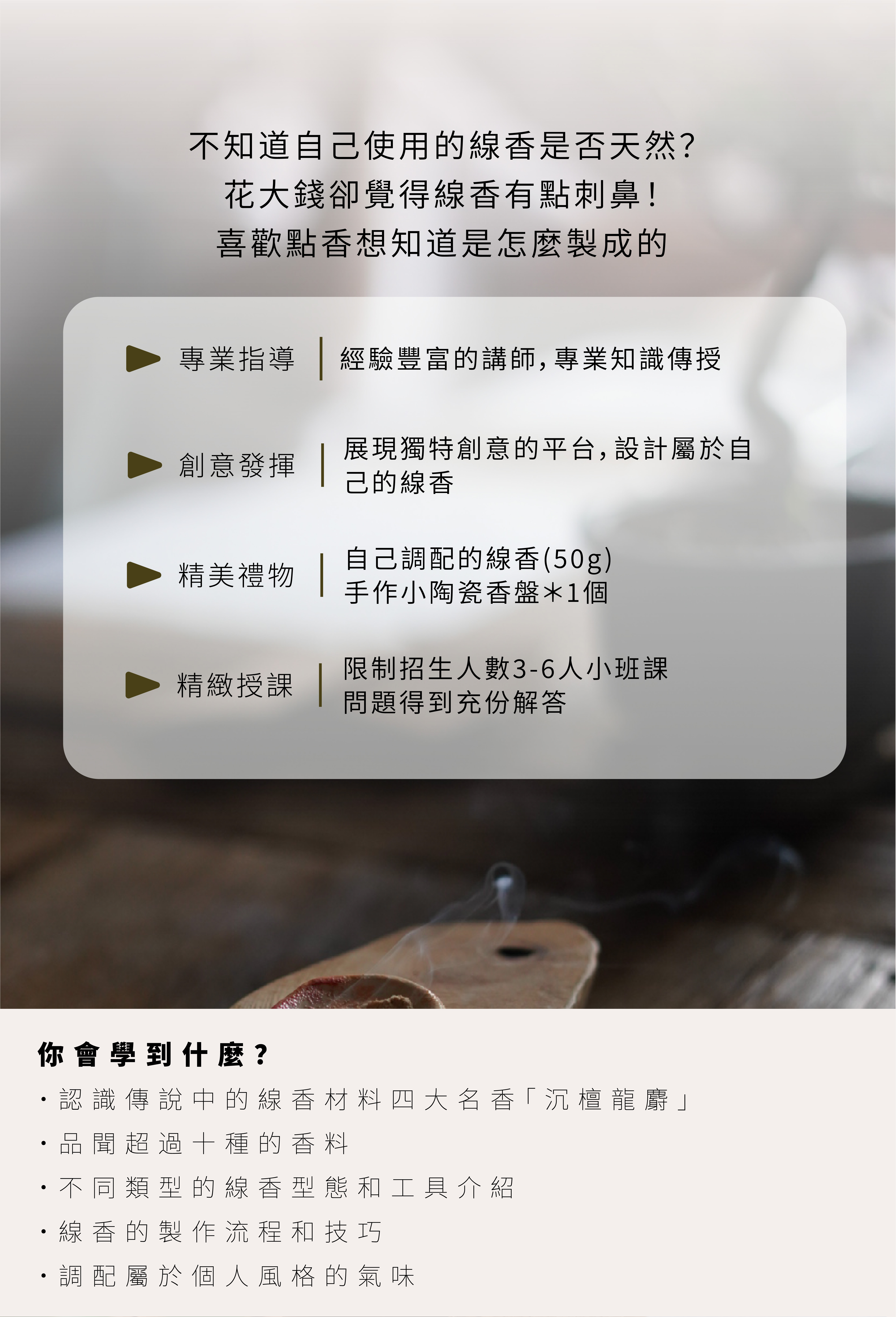 🎁 精美禮物:課程結束將會讓你帶回屬於自己調配的線香外,還有一份手作線香學習單與手作小香盤,讓您能夠在回家以後也能持續創作。