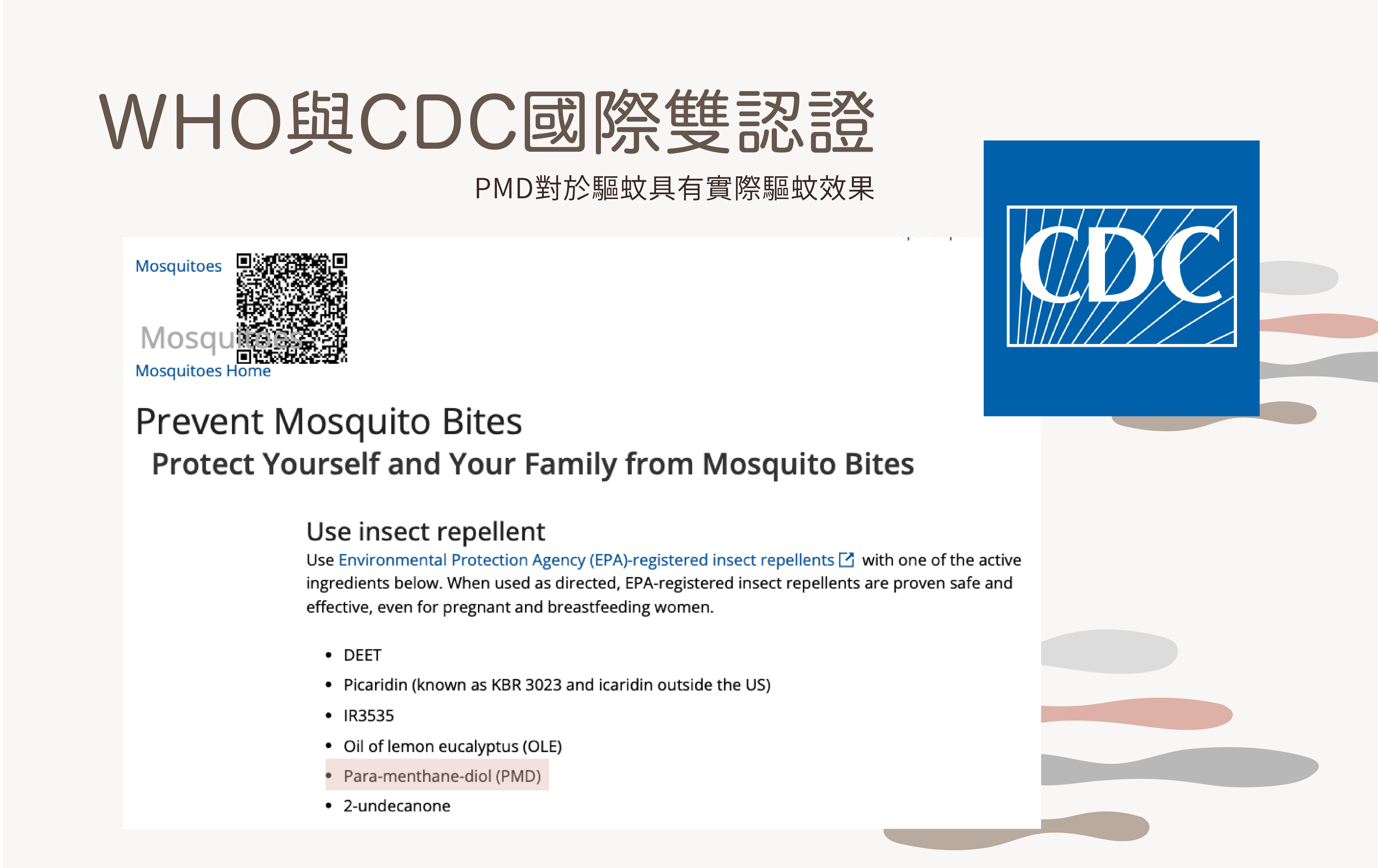 使用天然植萃的檸檬桉(PMD),PMD是WHO與美國疾管局CDC認可有效防蚊的成分之一