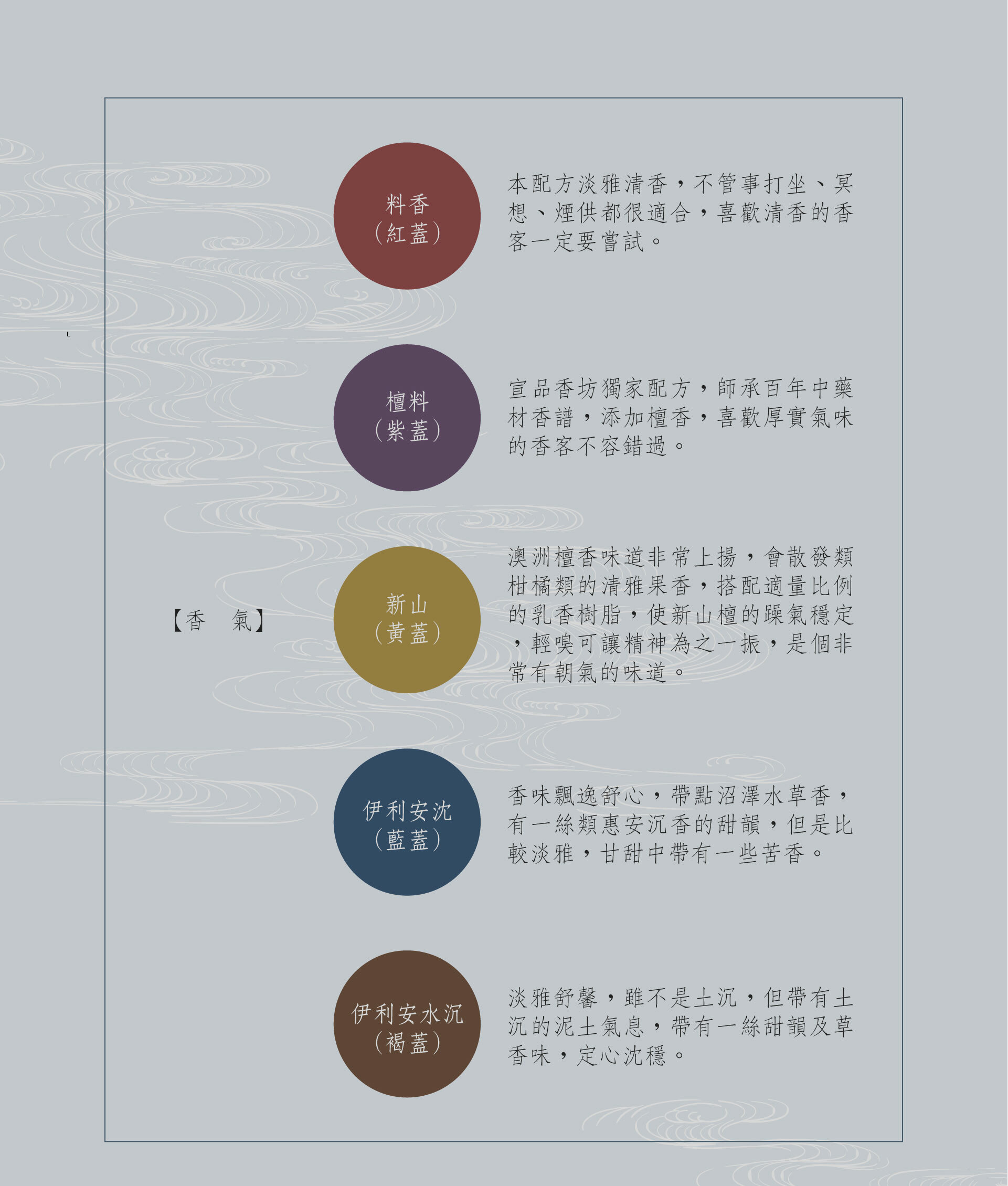 原料成分:西澳新山、乳香樹脂、楠木粉(黏粉)