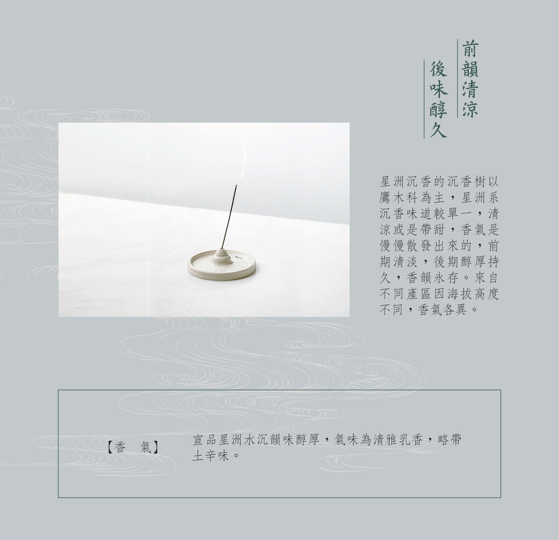 星洲水沉氣味特性較為韻味醇厚及清雅乳香,略帶土辛味。